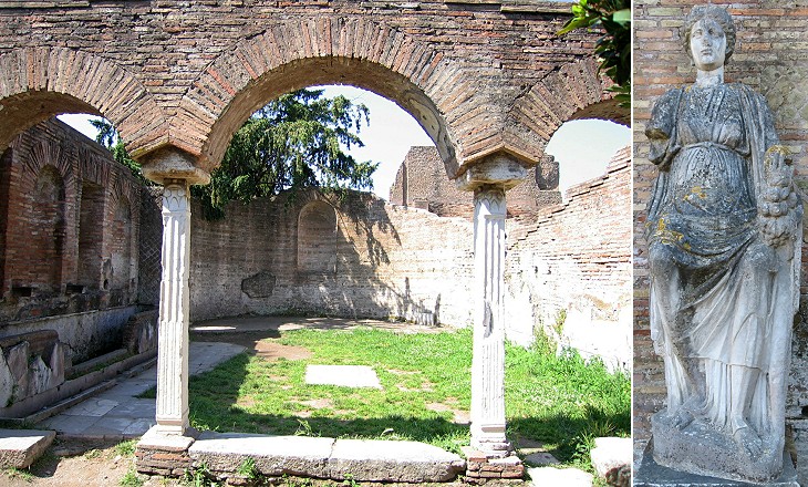Domus della Fortuna Annonaria: (left) hall with an apse and a fountain; (right) statue of Fortuna Annonaria or personification of Ostia