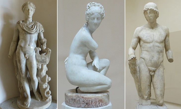 Museo di Ostia Antica: (left) Apollo Citharoedus (playing the lyre) from Casa del Protiro; (centre) Crouching Venus from Domus della Fortuna Annonaria; (right) Apollo found into many broken pieces near Decumanus Maximus and similar to the Apollo portrayed on the Temple to Zeus at Olympia