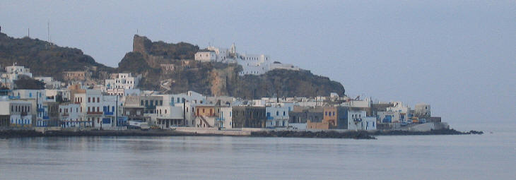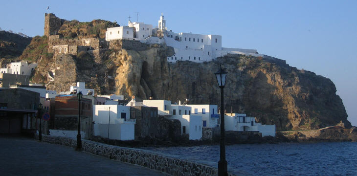 Mandraki, the chief town of Nisyros, is built at the north-western corner of the island by the site of the Greek and mediaeval capitals. Here is a long and somewhat narrow hill, cut off by a low valley to the south, and by a deep ravine to the east, and further defended by precipitous cliffs against the sea. The old town of Mandraki is built in the ravine to the east of the castle and is invisible from the sea. (..) In antiquity it was partly independent, and partly subject to Rhodes; in the middle ages it was, till the Ottoman conquest, under the Knights of Rhodes.