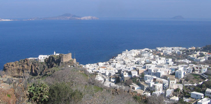 View of Mandraki from Paleokastro: in the distance the islets of Gyali and Strongyli and (barely visible) Kos