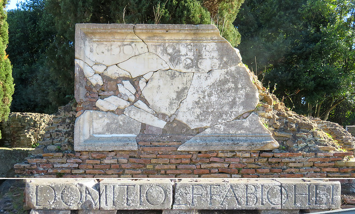 A tomb situated very near the gate was obviously more visible than one placed in a row of similar buildings. C. Domitius Fabius Hermogenes was a young knight and a magistrate of Ostia to whom an equestrian statue was erected in the Forum. He had public funerals and his tomb was built by his father very near Porta Romana on the site of a previous one. The building itself is almost entirely lost, but parts of its inscriptions were found and have been placed on a remaining wall.