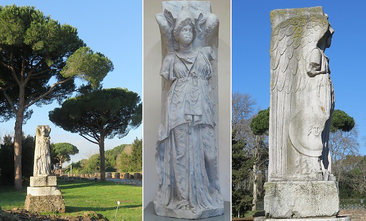 Today this statue stands at the centre of Piazza della Vittoria, a large empty space which does not correspond to a square of the ancient town. With a twin statue it was most likely placed at the sides of the external inscription of Porta Romana as a caryatid (it is actually a sculptured pillar). According to some art historians it is more likely a sculpture of the Ist century BC, rather than one of the time of Domitian (81-96 AD). Perhaps it decorated the old gate and it was reutilized for the new one. It has become a symbol of Ancient Ostia and it can be seen in monuments of Lido di Ostia, the modern seaside resort to the west of the Roman town.