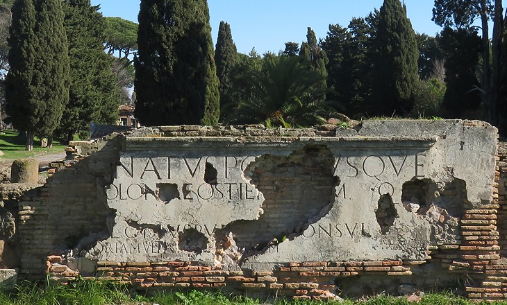 Tiny fragments of the inscription which stood above the arch of the gate were found and were integrated with modern additions in order to make them at least partially readable. According to a first reconstruction the inscription began with the words Senatus Populusque Coloniae Ostiensium (The Senate and the People of the Colony of Ostia) and towards the end it said portam vetustatem corruptam, a reference to a previous gate which was falling apart. Eventually the first words were interpreted as Senatus Populusque R(omanus) Coloniae Ostiensium (The Senate and the People of Rome - gave to - the Colony of Ostia). This new reading suggests that the construction of the gate was decided by the Roman Senate, which makes more sense because Ostia did not have senators, but a city council of 100 decuriones.