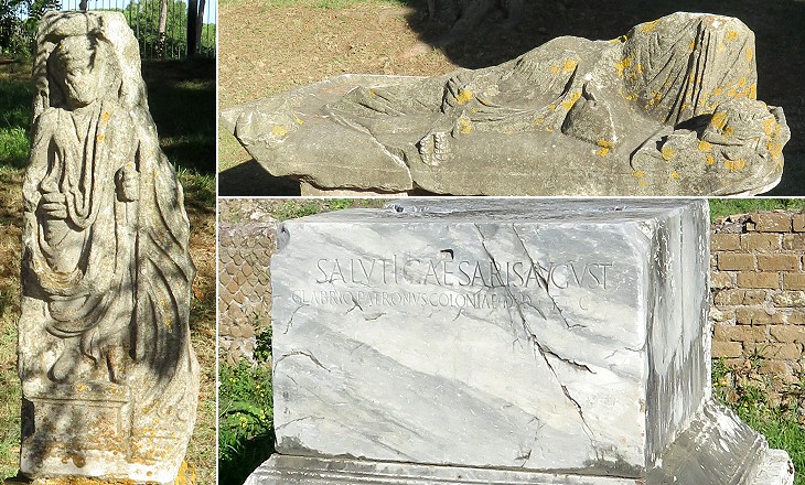 Sarcophagi from Pianabella: (above) Centauromachy (fight between men and centaurs) at Museo di Ostia Antica; (below) Sarcophagus of Titus Flavius Trophimas at Museo Nazionale Romano