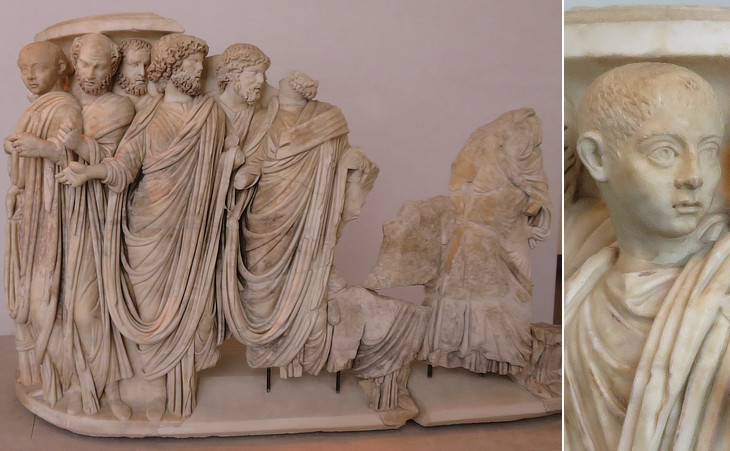 Archaeologists found at the necropolis of Pianabella many interesting and finely executed sarcophagi. Their fronts were usually decorated with mythological scenes, but in some instances the scenes were related to everyday life. The sarcophagus of Trophimas tells us that not only the very rich could afford being buried in a sarcophagus. It shows on the left craftsmen at work (a shoemaker and a rope-maker) and on the right two musicians or perhaps two worshippers of Isis performing a ritual dance. From the inscription we know that Trophimas was a Greek artisan from Ephesus and the two craftsmen might have been friends of his.