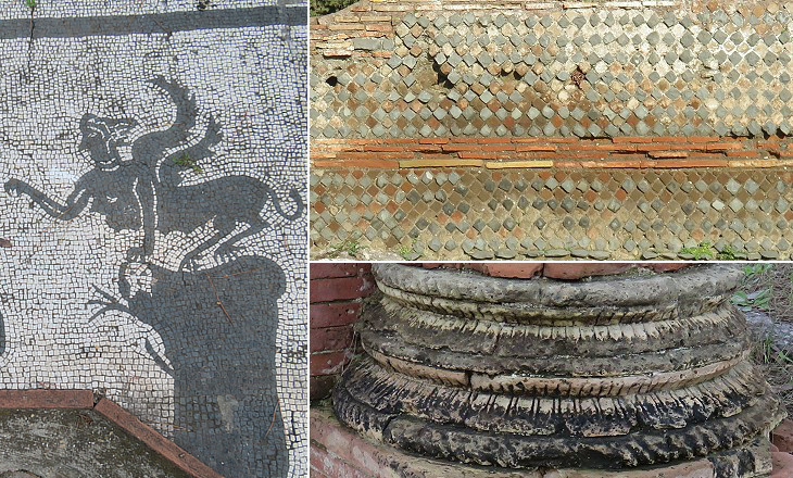 (left) Fragment of a mosaic depicting Oedipus' Sphinx from the necropolis of Pianabella (see the same subject in a cinerary urn at Volterra); (right-above) wall of an "utilitarian" building; (right-below) plastered base of a brick column