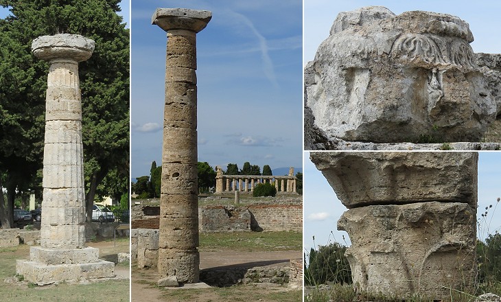 (left/centre) Reconstructed Doric columns; (right) capitals of the Roman period
