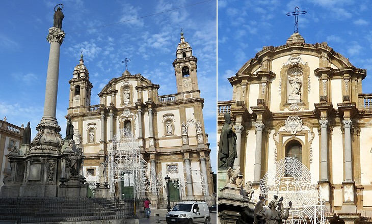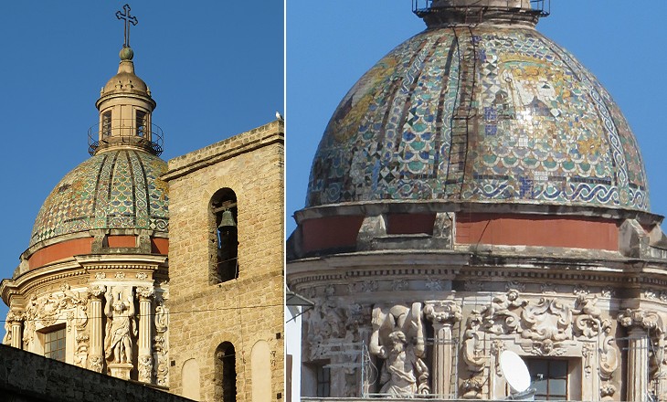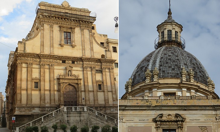 S. Caterina della Ruota: (left) façade (opposite S. Maria dell'Ammiraglio aka La Martorana); (right) dome seen from Piazza Pretoria