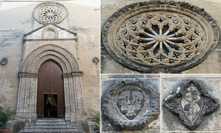 S. Agostino: (left) portal; (right-above) rose window; (right-below) coats of arms of the Chiaramonte (left) and of the Sclafani (right)