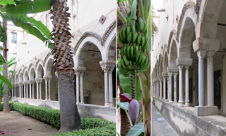 The cloister was redesigned in the XVIth century by Vincenzo Gagini, grandson of Domenico, but it retains some elements of the original building. The latter was characterized by zigzag mouldings, typical of Norman architecture and very thin columns, typical of Catalan Gothic style (see a detail of St. Yves' Gate in the Cathedral of Barcelona - it opens in another window).