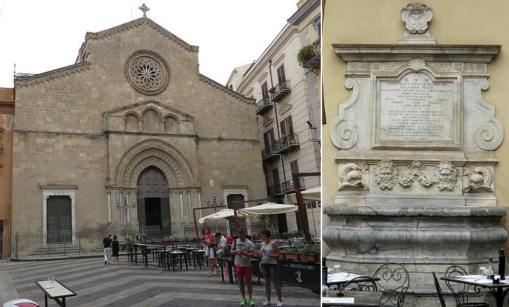 S. Francesco: (left) façade; the rose window is a XIXth century addition identical to that of S. Agostino; it replaced a previous simpler rose window which was damaged in 1823; (right) 1777 fountain in the square which houses the outside tables of Antica Focacceria S. Francesco, founded in 1834