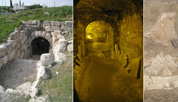 Aya Thecla: (left) entrance to the cave; (centre) main chapel; (right) an ancient capital and a christogram (a monogram symbolizing Jesus Christ)