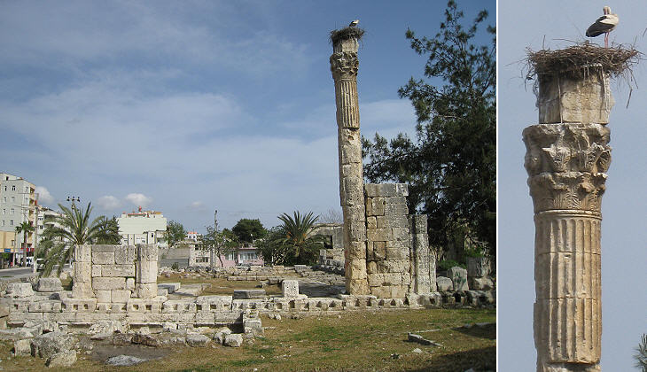 Ancient Seleucia had several temples, but only one of them is left and only one column is not broken. The temple was dedicated to Zeus, but today it is commonly referred to as the Temple of the Storks. You may wish to see other ancient columns in Turkey which were chosen by storks, e.g. at Ankara and Milas.