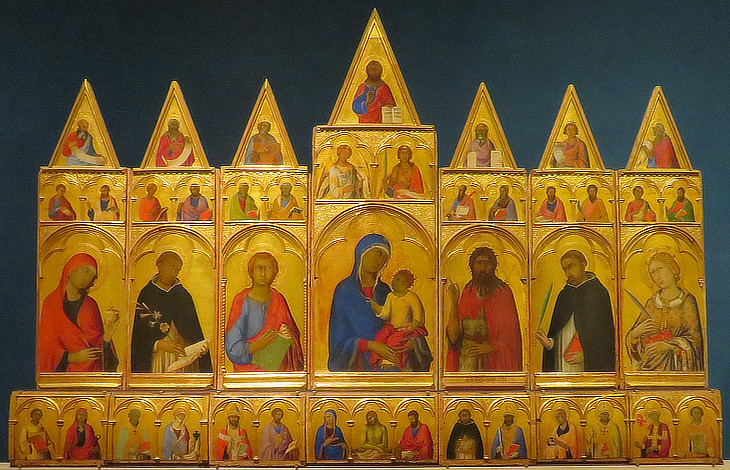 This large polyptych by Simone Martini stood on the main altar. It is signed SYMON DE SENIS ME PINXIT in the central panel with the Madonna and Child. It is Martini's largest work, and includes numerous sub-panels. The altarpiece consists of seven main elements, each one in three parts: a cusp, a smaller panel divided into two sections, and a larger panel depicting a single saint. There is also a predella consisting of seven smaller size panels. There are 15 predella figures, an upper row with other 14 figures and seven cusps with other characters for a total of 44 figures. The central panel depicts the Madonna with Child; the remaining six main panels portray (left to right): St. Mary Magdalene, St. Dominic, St. John the Evangelist, St. John the Baptist, St. Peter of Verona (a Dominican preacher) and St. Catherine of Alexandria. In the cusps, next to the Blessing Christ, are prophets and patriarchs. The predella shows Christ in the Sepulchre with the Madonna and St. Mark and six couples of saints.