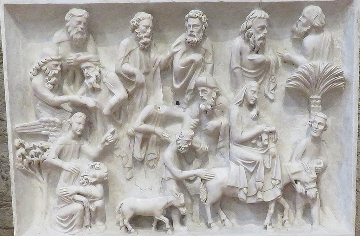 Museo Nazionale di San Matteo: relief showing the Dream of Joseph, the Flight to Egypt and other scenes of Jesus' life from the pulpit of S. Michele in Borgo by Lupo di Francesco; the image used as background for this page shows an isolated bust portraying Christ in Majesty inside the church