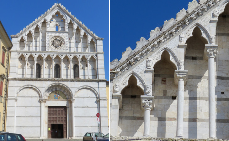The church of S. Michele in Borgo attributed to Fra Guglielmo, has three tiers of arcading, but the arches that spring from the colonnettes are pointed and have trefoil cusping. Otherwise the general design, with a high central part corresponding to the nave, and triangular sloping wings at a lower level corresponding to the aisle, is precisely that of the Duomo and of S. Paolo a ripa d'Arno on a reduced scale.