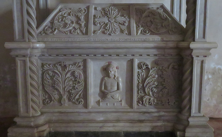 On the l.- hand side of the door, at the bottom of the nave, is the monument of Simone Saltarelli, Bishop of Parma, and afterwards Archbishop of Pisa (died 1342). It is composed of an altar tomb with bas-reliefs; the canopy above is supported by ill-shaped arches; it has marble draperies, which angels draw back, exhibiting the effigy below, which is hardly to be seen in the darkness. It is fine, though cut on the outside only for effect. (..) The bas-reliefs below have character and expression, but the rest is of rude and clumsy workman-ship. Murray
