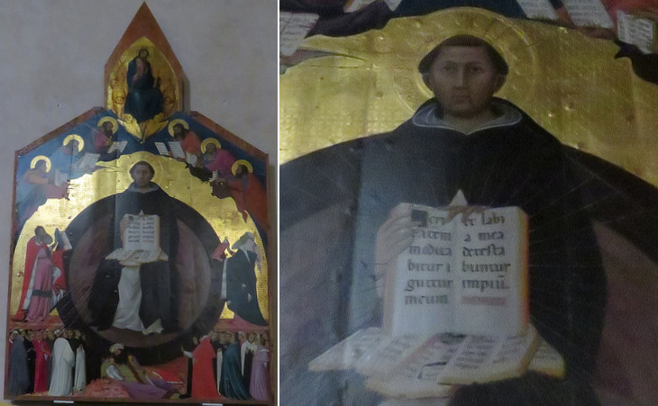 S. Caterina: (left) "The Triumph of St. Thomas Aquinas" (1323) once attributed to Francesco Traini and today to Lippo Memmi from Siena, brother-in-law of Simone Martini; (right) detail showing St. Thomas holding the initial pages of "Summa contra Gentiles" (Summary against the unbelievers), one of his most important treatises which is introduced by a quotation of Prov. 8.7. "Veritatem meditabitur guttur meum, et labia mea detestabuntur impium." (for my mouth will utter truth; wickedness is an abomination to my lips)