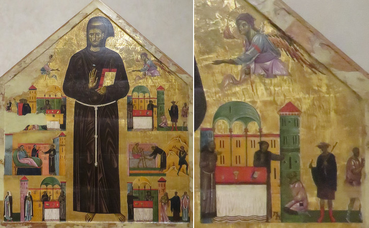 Museo Nazionale di S. Matteo (from S. Francesco): "Dossale" (altarpiece placed behind the altar, an early form of polyptych) portraying St. Francis by Giunta Pisano (ca 1255), and a detail depicting the miracle of the cripple who was cured at a shrine having a bell tower resembling the Leaning one (all six scenes depict thaumaturgic miracles)