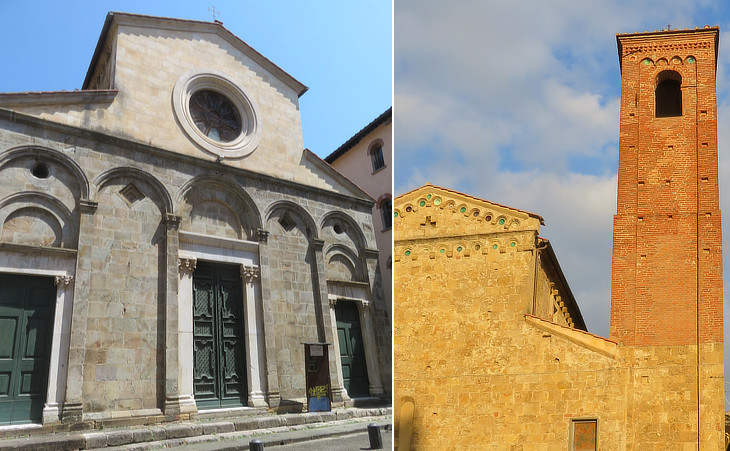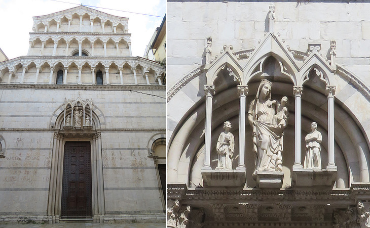 San Michele in Borgo: (left) façade; (right) central portal with a group of statues by Lupo di Francesco (originals at Museo Nazionale di S. Matteo) which are very similar to those he made for the Camposanto