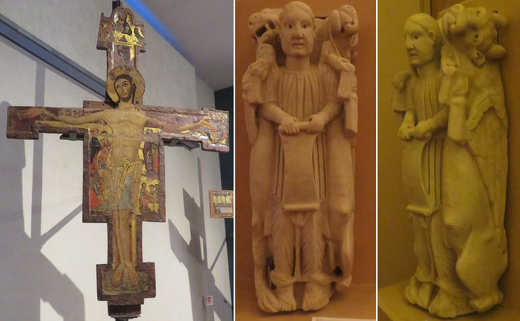 Museo Nazionale di San Matteo from S. Paolo all'Orto: (left) Crucifix, similar to those at S. Frediano and at S. Sepolcro with scenes from Jesus' life (they are all characterized by portraying Jesus with open eyes); (centre/right) lectern support of the pulpit (late XIIIth century)