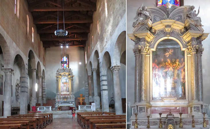 San Michele in Borgo: (left) interior (reconstructed after WWII); (right) main altar (XVIIIth century - see a similar one of the same period at S. Sisto)