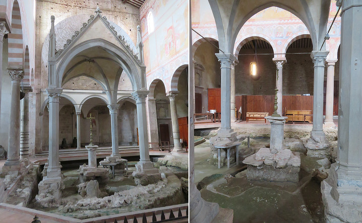 The column of St. Peter, on which the Apostle placed a large stone to celebrate mass stands under a Gothic canopy. According to tradition, Pope St. Clement, the third (or the fourth) Bishop of Rome, in the act of consecrating the altar of Peter, had an episode of epistaxis and a few drops of his blood fell on the stone. Around it are the remains of the first early Christian church of the Vth century and of a three-apse church of the VIIIth century. Nearby Volterra claims that Linus, a citizen of that town, was converted by Peter on his way from Pisa to Rome. Linus became the second Bishop of Rome.