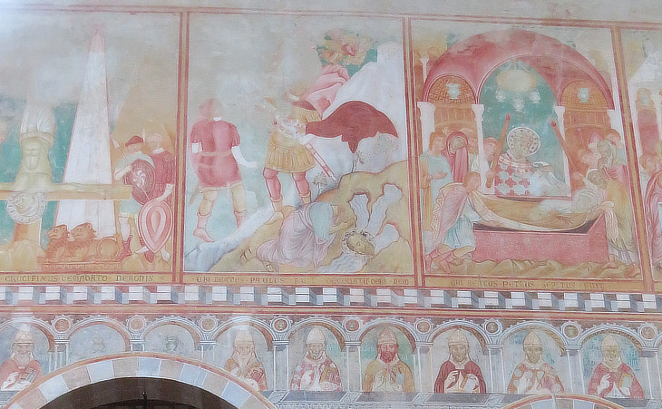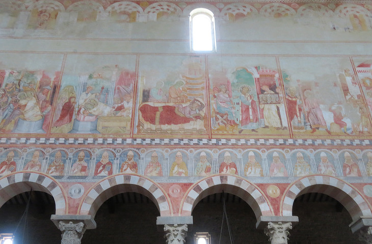The nave was decorated with a cycle of large frescoes during a period of great splendour for the basilica, an important stop for many pilgrims for whom a (lost) portico was built around the building. The frescoes are divided into three bands: (above) angels inside fake windows; (middle) events of the lives of St. Peter and other saints; (below) portraits of popes, from St. Peter to John XIV (late Xth century). Similar galleries of portraits of popes can be seen in the Cathedral of Siena and at S. Paolo fuori le Mura. The black and white decoration of the arches calls to mind that of mosques; fake metal discs were painted above each column.
