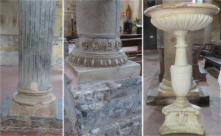 (left/centre) Details of the bases of the columns; (right) Renaissance holy font
