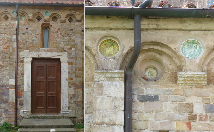(left) Southern entrance; (right) pottery decoration, most likely from Moorish Spain; it can be seen also in many churches of Pisa and in some Romanesque bell towers of Rome e.g. that of SS. Giovanni e Paolo