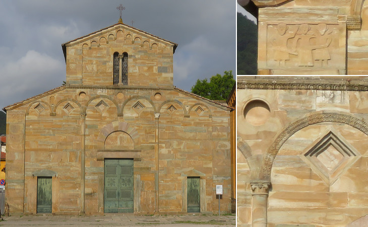 Pieve di Santa Maria at the foot of Vicopisano: (left) façade; (right-above) a rough relief, older than the church and maybe depicting the decollation of St. John the Baptist; (right-below) a typical rhomb decoration of Pisan architecture