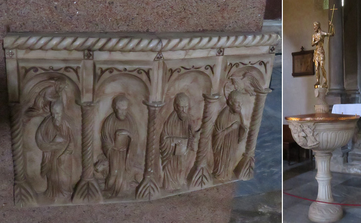 Pieve di S. Maria: (left) medieval relief depicting the Four Evangelists and their symbols; (right) Renaissance baptismal font