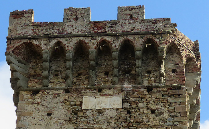 Top of Torre del Mastio, the keep of Rocca Nuova, with the symbol of Florence, a lily which is shown in the image used as background for this page
