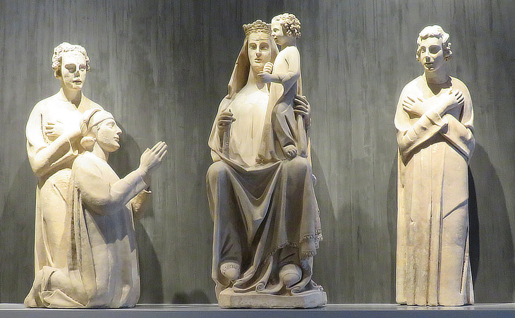 Museo dell'Opera del Duomo (in a building near the Leaning Tower): statues above the portal: Madonna and Child, two angels and the donor (of the same size of the other statues) by Lupo di Francesco (ca 1320); the Madonna is portrayed in the same posture as those by Giovanni Pisano in the Cathedral and the Baptistery