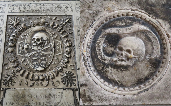 Memento Mori tombstones: (left) Garzia di Federico di Alcaraz, a magistrate of Pisa of Spanish origin in 1557; (right) Dean Gregorio Leoli (d. 1527) "Egrediemur in die novissima" (We will get out in the last day)