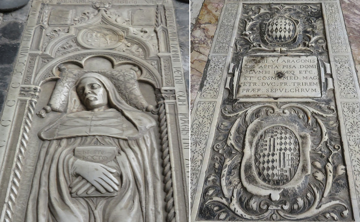 (left) Tombstone of a dean of the Cathedral (d. 1428) by Antonio, a sculptor from Carrara; (right) tombstone of Jacopo VI Appiani d'Aragona (d. 1585), Lord of Piombino, a port south of Leghorn, and commander of the fleet of Grand Duke Cosimo I de' Medici