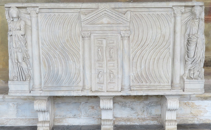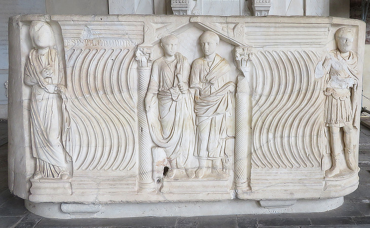 The collection of Roman sarcophagi at the Camposanto includes examples of the most popular subjects and techniques. We know that sarcophagi were made at workshops in towns near quarries or where a school of sculptors had developed. They were then shipped to the four corners of the Empire. See a page on the manufacturing and trading of Roman sarcophagi and directories of sarcophagi shown in this website from Rome and its environs and from other locations of the Empire.