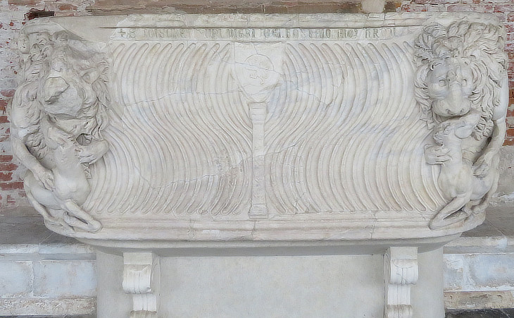 Sarcophagus of Abbot Benedetto, with festoons held by genii and lion masks, very similar to Roman models (see two sarcophagi at Palazzo Barberini), but with some Christian symbols (see a mosaic at S. Costanza) by Andrea di Francesco Guardi (1443)