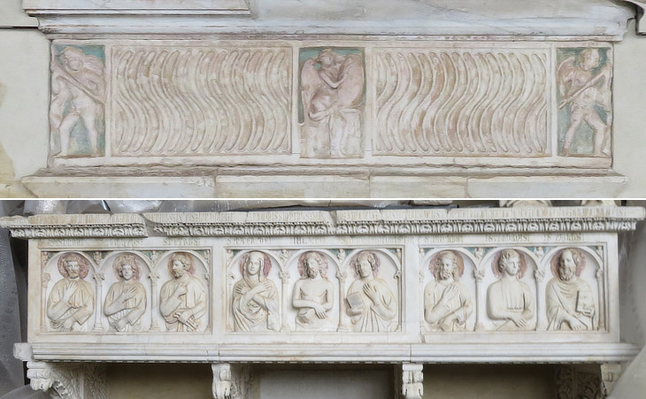 (above) Sarcophagus 62: a depiction of Victory writing on her shield (see a relief of Colonna Traiana) IIIrd century AD but re-used for Blessed Giovanni della Pace (d. 1325); (below) Monument of the della Gherardesca family by Lupo di Francesco (1320 ca)