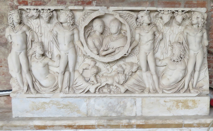 Sarcophagus 31 (IIIrd century AD) portraying the dead in a "clipeus" (a round shield) held by two of the Four Seasons; the "clipeus" is decorated with worn out zodiacal symbols (see a similar sarcophagus from Porto); the two reclining figures portray Earth and Oceanus (with crab horns), an unusual subject in sarcophagi but very frequent in floor mosaics