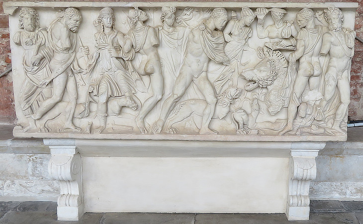 Sarcophagus 24 (IIIrd century AD) depicting the myth of Meleager who together with Atalanta, Artemis and others hunts the Caledonian wild boar