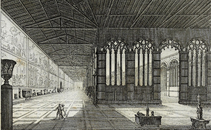 The Pavement which is all of Marble, with Divisions of several Colours, has under it the sepulchres of the then noble Families of Pisa, And if departed Souls have any pleasure in the Position of the Carcasses they have left behind them, sure those of this place have A large proportion of it. All along the Wall of the Cloysters near the Area, under the Windows, are antique sarcophagi of White Marble, with Basso-Relievo's. The other Walls are all painted in Fresco, quite round, and from top to bottom, by some of the first Restorers of Painting in Italy, after the terrible shock all Arts Had there, by the incursions of the barbarous Nations. Wright