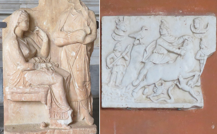 Additions to the sarcophagi collection of the Camposanto: (left) fragment of a IVth century BC funerary relief from Athens (acquired in 1826); (right) small relief depicting Mithra slaying the bull (see other similar reliefs)