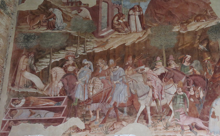 The Triumph of Death: the three kings come upon three corpses by Buonamico Buffalmacco (his frescoes were attributed to Andrea Orcagna until 1974); see this subject in a XIIIth century fresco in the Cathedral of Atri