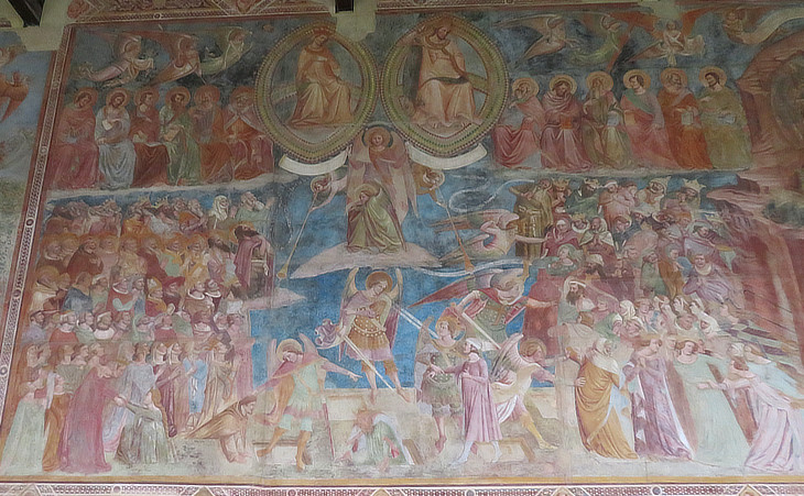 The fragments of painting that remain are fortunately the best; for one is safe in believing that a host of undimmed neighbours would distract but little from the two great works of Orcagna. Most people know the "Triumph of Death" and the "Last Judgment" from descriptions and engravings; but to measure the possible good faith of imitative art one must stand there and see the painter's howling potentates dragged into hell in all the vividness of his bright hard colouring; see his feudal courtiers, on their pal freys, hold their noses at what they are so fast coming to; see his great Christ, in judgment, refuse forgiveness with a gesture commanding enough, really inhuman enough, to make virtue merciless for ever. (..) For direct, triumphant expressiveness these two superb frescoes have probably never been surpassed. James