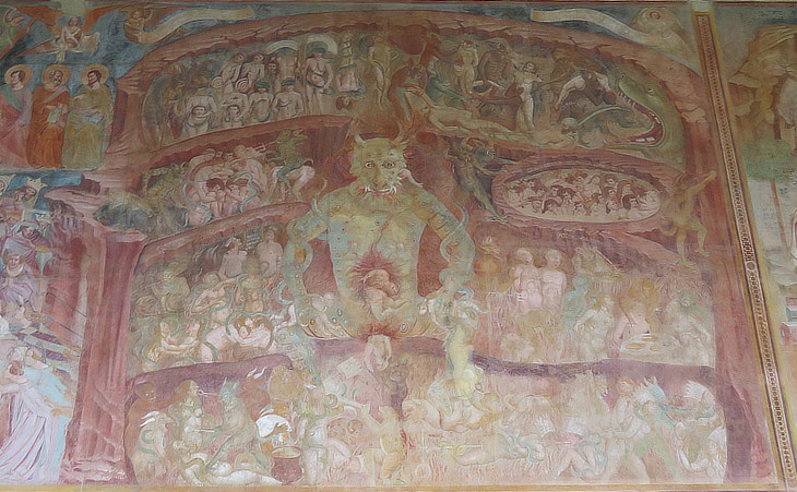 The Subjects are chiefly Scriptural, with an Addition of some of their own Legends, and other Fancies, Which have some Particulars which are whimsical and extravagant enough. To begin with the South Side; The first Design is what indeed more particularly suits a Caemeterium; they call it the Triumph of Death. (..) Angels are taking the Souls the Just out of the Mouths in the shape of little naked Infants: Devils those of the Reprobate; which are represented more gross. An Angel and a Devil have got that of a fat Friar between them, in the Air, tugging Hard, one at each end, which shall have him. Wright