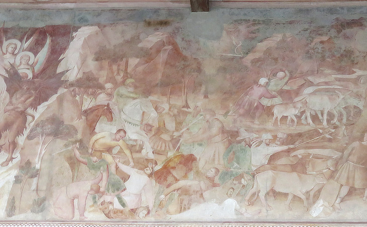 Misfortunes of Job: The Invasion by the Sabeans by Taddeo Gaddi (for a long time his frescoes were attributed to Giotto - see one of his paintings at Castiglion Fiorentino and read Vasari's comments about him)
