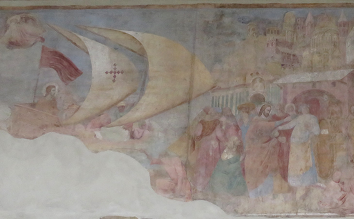 The series illustrates the life of St. Ranieri, who was held in great veneration in Pisa, his native town. They are painted in six compartments - the three uppermost are by Memmi only, the others by Antonio Veneziano, who died in 1384. (..) St. Ranieri embarks upon a Galleon for the Holy Land. It is not easy, however, to make out what is the subject of this picture. It seems to be St. Ranieri returning in a Pisan vessel, bringing the relics of some saint. Murray