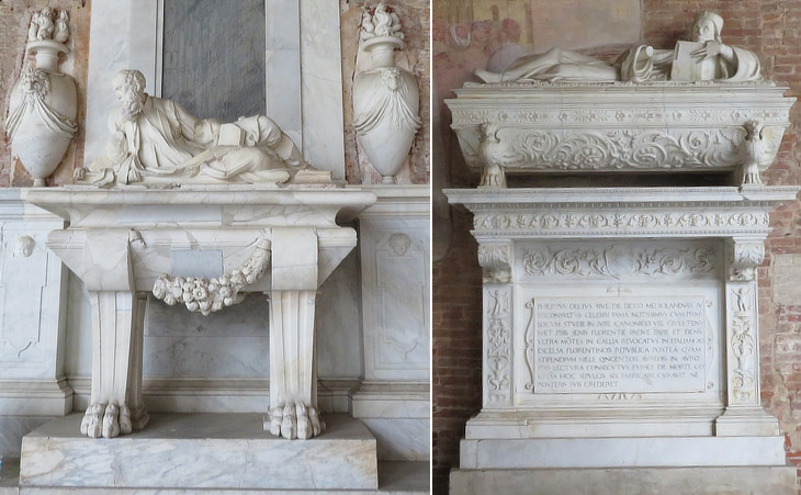 Renaissance monuments: (left) Monument to Matteo Corte (philosopher and physician) by Antonio di Gino Lorenzi and Pierino da Vinci, based on a drawing by Nicoḷ Tribolo, a celebrated sculptor and architect (see a fine relief by him at Loreto); (right) Monument to Filippo Decio (Law professor) by Stagio Stagi (1527)