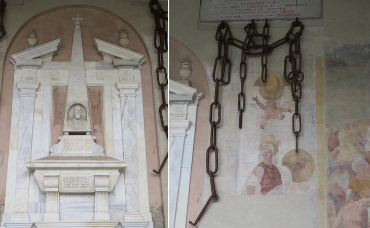 (left): Monument to Bartolomeo Medici by Giovanni Bandini and Valerio Cioli (1573), similar to that to Matteo Corte; (right) chains from the Port of Pisa given back by Genova